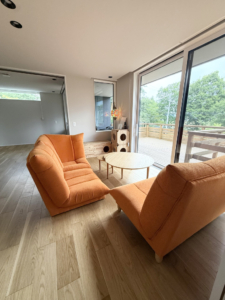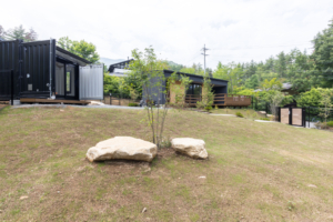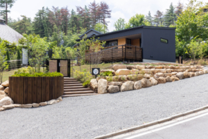 長野県安曇野市の豊かな自然に囲まれた閑静な温泉別荘地の一角にある、約1000平米の敷地丸ごと貸し切り、完全非対面・非接触・無人チェックインの宿泊施設です。
